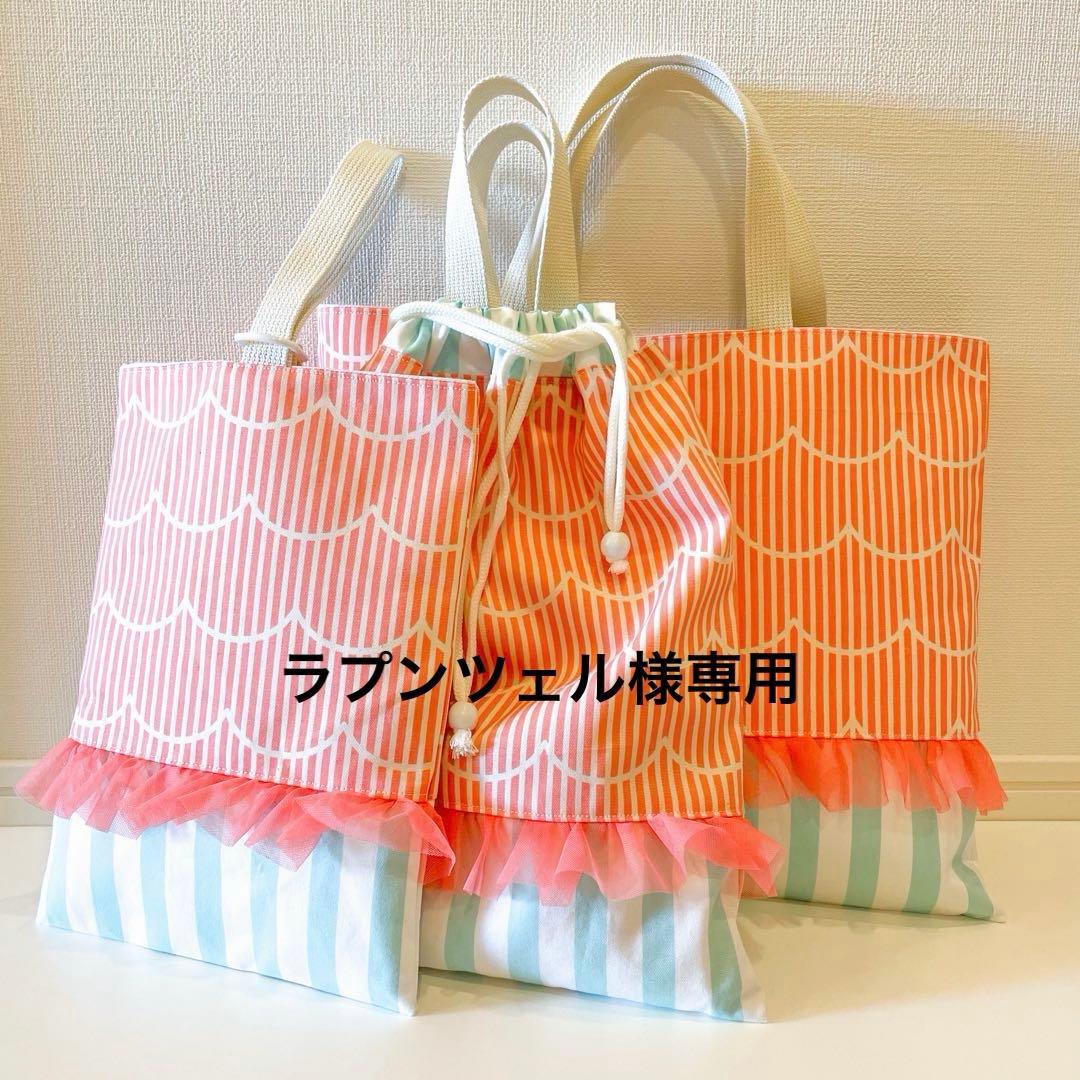 ハンドメイドのレッスンバッグ、体操着袋(お着替え袋)、上履き入れ、お弁当袋、コップ袋の5点セットです\r\r※全て単品購入可能です(送料別、手数料込)\r\r【レッスンバッグ】\r約30㎝×40㎝×マチ4㎝\r持ち手38㎝\r単品2300円\r※フックにかける用ループ追加…+200円\r\r【上履き入れ】\r約25cm×22cm×マチ4cm\r持ち手15.5cm\r単品1500円\r\r【体操着袋(お着替え袋)】\r約37㎝×30㎝×マチ4㎝\rフック用ループ片側のみ\r単品2300円\r※ナップザック型へ変更…+200円\r\r【お弁当袋】\r約18.5cm×24cm×マチ10㎝\r単品900円\r※コロンとまん丸給食袋への変更無料\r\r【コップ袋】\r約18cm×17cm×マチ6cm\r単品800円\r※コップ袋のsetをコロンとまん丸給食袋への変更は+100円\r\r5点で7800円+ゆうパケットポスト送料\r\r※追加のお品がありましたら別途送料いただく場合がございます\r\r裏付き&ワンポイントにラメワッペンつき、ノーアイロンで扱いやすくシワになりにくくアイロン不要で洗って縮みの少ない生地を使用しております\r\r気をつけて製作をしておりますが、ハンドメイドにつき多少のズレなどご理解いただける方のみご購入ください\r\r※サイズ変更・生地の組み合わせなどのオーダー不可\r※マチなしへ変更…0円\r\r\r製作するうえでサイズをはかるために水で落ちるチャコペンを使用しております。\r汚れではなく、お洗濯で必ず落ちるものですのでご了承ください\r\r※同柄のランチマットは基本サイズで縦25×横35cm程度で、同梱800円~でお作り致します。製作できるかどうか生地の残量にもよりますので先にご相談ください\rまた、園によってサイズも違うかと思いますので参考価格をプロフィールにてご確認のうえご相談させて下さい\r\r#fufumo