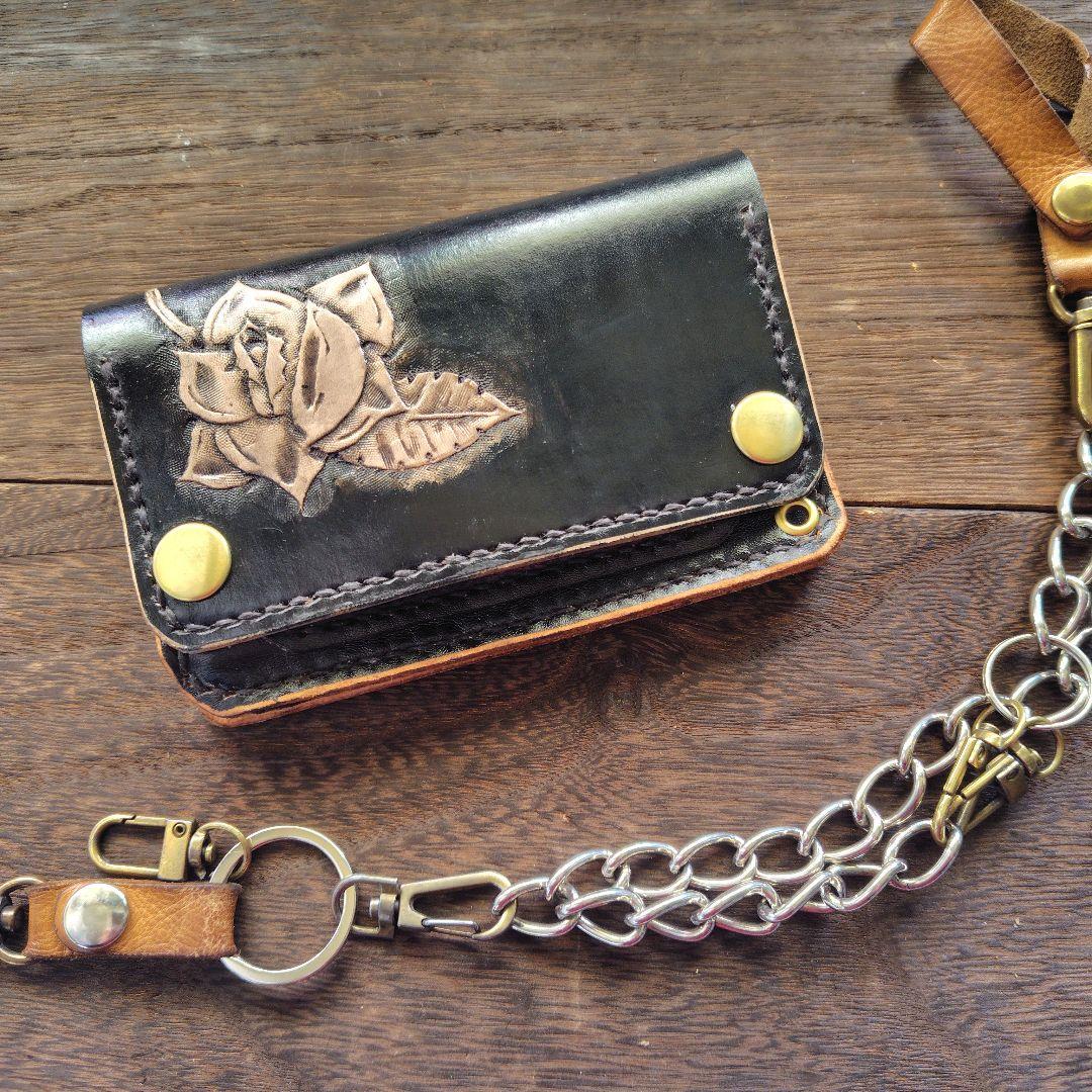 ※ウォレットチェーンセット出品ご覧頂きまして誠にありがとうございます。姫路レザータンニン鞣しヌメ革丸染め(ブラック)と姫路レザークロコダイル型押し革(牛革)で作成した横幅約15センチのミドルトラッカーウォレット(2.5層)になります。※お札を折らずに収納可能です糸はボンド加工糸のブラックジャンパーホック 金具類はシルバーになります。ファスナーはYKK シルバーウォレットチェーンは喜平シルバーチェーン(鉄製)線径約3ミリと少し太めなチェーンになります。重みがあり丈夫なチェーンになります。・ウォレット縦約9センチ横約15センチ厚み約1.7センチ(ジャンパーホック含めて)※多少の誤差があります・チェーン全長約35センチ(ベルトループ ナスカン含めて)※多少の誤差がありますケース×1お札入れ×1(二つ折りor折らずに収納)隠しカードポケット×1フリーポケット×1カードポケット×1即購入大歓迎です!ご検討よろしくお願い致します^_^※ハンドメイド品になりますので、作成時につく僅かな傷、汚れ 等 ご理解の程よろしくお願い致します。※革特有の傷、シワ 等 ある場合があります事もご理解の程よろしくお願い致します。#姫路レザー#トラッカーウォレット#ミドルトラッカーウォレット#ミドルウォレット#コンパクトトラッカーウォレット#ミニトラッカーウォレット#レザークラフト#ロングトラッカーウォレット#レザーウォレット#ハンドメイドウォレット#薄型財布#バイカーズウォレット#ウォレットチェーン#チープ#トラッカーウォレット#ハンドメイド革財布#ミニトラッカーウォレット#本革#USA製トラッカーウォレット#牛革#トラッカーズウォレット#ビンテージ#革財布