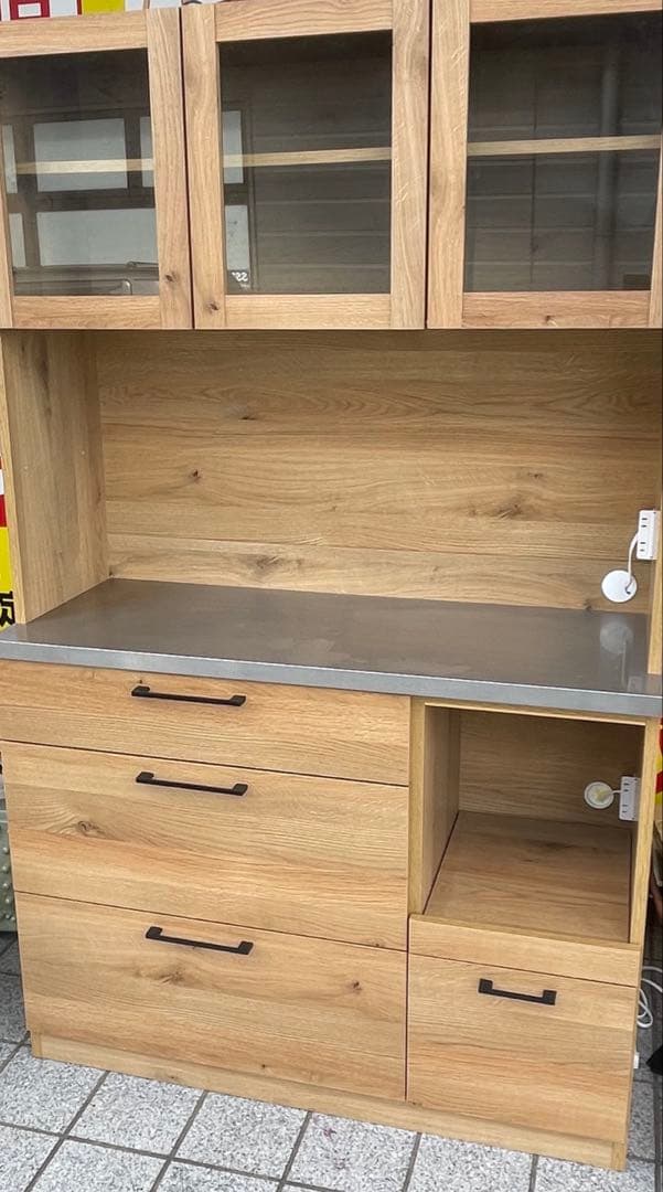 【値下げしました】ニトリのレンジボードです。シンプルデザインが魅力、どんなお部屋にもあわせやすい。安心の耐震機能も充実。サイズ 幅60×奥行40×高さ181cm2020年新品購入しましたが、引越し先で使用する予定がないので出品しました。写真は使用感も含めお皿など入れた状態で写してます。上の扉ついてる食器棚は綺麗ですが、レンジ台と炊飯器のスライド台多少汚れがあります、写真でご確認ください。出荷の際はもちろん食器、荷物等抜いた状態で配送いたします。即購入okです。梱包・発送たのメル便で発送いたします。送料12000円込みの値段になります。