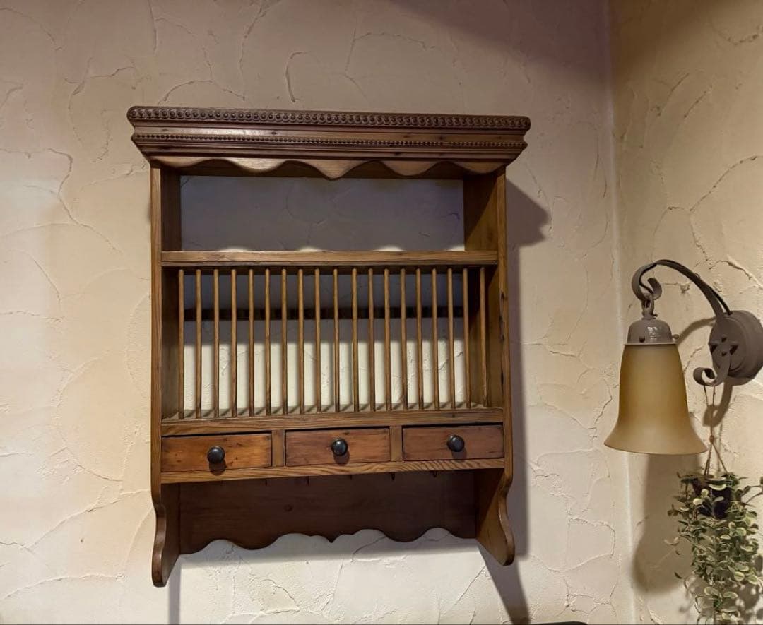 数年前にアンティークショップで購入したラックですキッチンまわりで飾っておりましたキレイな状態だとは思いますがダメージはございませんが小さいキズはございます中古品をご理解いただきますようお願いいたしますガラス入り後ろ面の上2箇所に金具ついていますサイズW53cm H29.5cm D12cm
