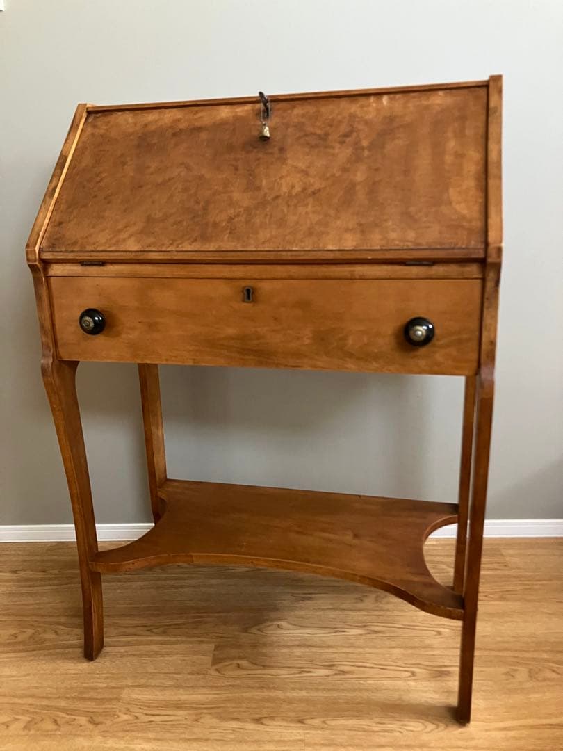 古道具を取り扱っているお店で購入しました。写真に写ってるように所々に傷がありますが、味となっていてお部屋に飾っていると雰囲気が素敵です。パソコンや勉強机に。ペン置き場があり転がりません。折りたためるので、狭いスペースでも活躍してくれます。サイズ 天板横幅68センチ 奥行き53センチ 高さ74センチ(手前) 82センチ(奥)折りたたみ時横幅68センチ 奥行き14センチ 高さ82センチ※素人採寸になります。両側の横に折りたたむさいに引っ張って畳む為の金具があるのですが、左側しか動きません。ですが問題なく両方の足が折りたためます。開いた時も左側の金具を引っ張るだけでしっかり固定します。購入時に片方だけで大丈夫、と話があり問題なく使えています。購入後、何度か子供が使用していましたが、ダイニングテーブルでやりたがることが多くいつの間にか出番がなく終われていて勿体無いのでご使用して頂ける方にお譲りします。古い物で購入時から傷がありますので、ご理解頂ける方の購入をお願いします。湘南地域まで引き取りにきて頂ける場合、送料の分を値引かせて頂きますのでコメントをお願いします。