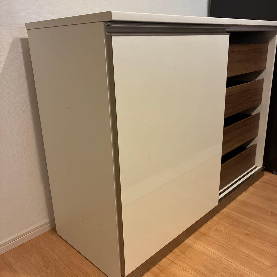 廃盤 ニトリ レジューム 120 WHITE です。学生の娘が1人暮らしで使用していました。目立つキズも無く引き出しや開きの作動も良好です。エナメルっぽいツヤのあるホワイトで大きさは 本体 幅120cm 高さ99cm 奥行き47cm炊飯器置き場:幅31cm 高さ33cm 奥行43cm。\r左に開き、中央引き出し3段、右側にコンセントとスライドテーブルと開きで現状モデルは幅が150cmと大きいので120cmは使い勝手がいいと思います。シッカリしていて重さも予測30kgほどあります。組み立ては不要です。\r梱包たのメル便で発送致します。(^^)