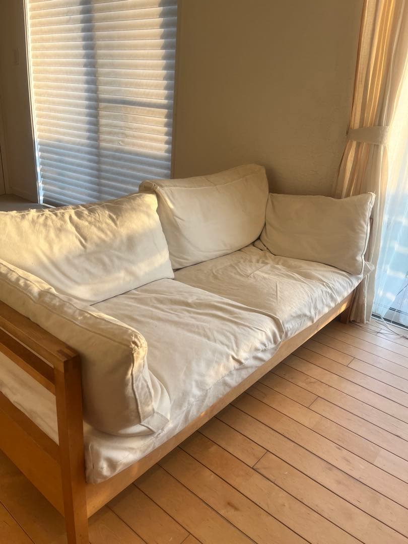 ウニコsophie (ソフィー)のソファです。大切にしていましたが、引っ越しに伴い手放すことにしました。布をかけて使用していましたが、アイボリー色の生地のため多少の黒ずみがあります。写真でご確認くださいませ。たのメル便で発送予定です。(送料込み)