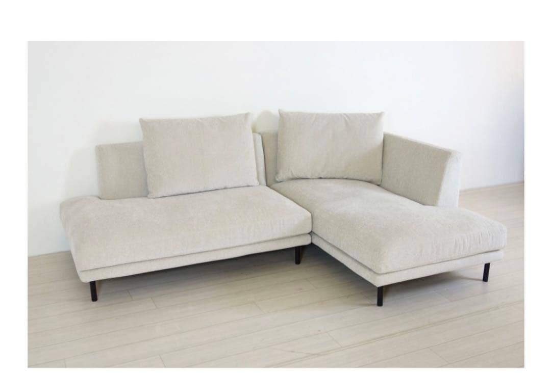 ベージュのファブリック製L字型ソファ、クッション付き。- 色: ベージュ- 形状: L字型- クッション: 1つ付属- 素材: ファブリック- 脚の素材: 木製ご覧いただきありがとうございます。