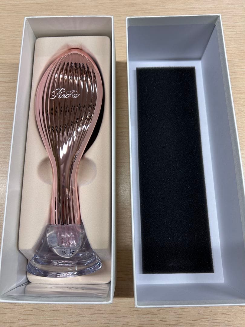 新品未開封です。重量:約 51g希望小売価格:11,880円(税込)最高級素材のボディに、「育成光線」と「マイナス電子」も備わっています。とかすごとに、ツヤを与え健やかで美しい髪へと導きます。クッションブラシを制作するのは、高級木製家具で有名な“飛騨”の木工職人。古くは日本書紀にも『飛騨の匠』として登場するほど長く培われ受け継がれた「技」が、一本一本に活きています。最高級素材・ブラックウォールナットを使用。使い込むほどに、髪もブラシも輝くツヤに。ブラシのピンは縦から見るとまっすぐ、横から見るとジグザグに並んでいます。ほつれた髪をとかす時は縦使い、テンションをかけたい時は横使い、用途によって使い分けることができます。うっとりと愛しみながら、髪に語りかけるようにゆっくりとブラッシングしてください。【徹底的に傷ませない】ルーヴルドーのこだわりがここにも活きています。自然が育んだ個性豊かな木目、心地よく手に馴染む曲線、このため息が出るようなコラボレーションを支える飛騨の匠の技。いくつもの工程を経て、一つひとつ丁寧に手作業で仕上げ、クッション材にピンを差し込むのもまた、人の手で行います。重ねた年輪に感じる愛着。天然木、手作業だからこそ生まれるそれぞれの個体差・個性も逸品の証です。ブラックウォールナットを使用した日本製のクッションブラシ。- ブランド: LOUVREDO- 商品名: Beauty Hair Cushion Brush- 製造国: 日本- 素材: ブラックウォールナットシャンプーブラシ頭皮用ブラシ頭皮ケア復元ドライヤー高級ブラシヘアブラシ高級ヘアブラシ頭皮ブラシクッションブラシパドルブラシ美容ブラシ美容室専売品