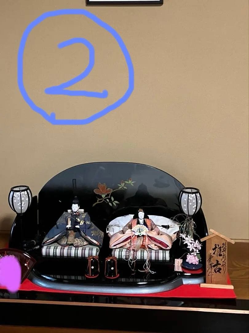 雛人形 オレンジと紫の衣装 落ち着いた淡い紫桜衣装の雛人形雛人形を金屏風と黒塗り台に並べる収納
